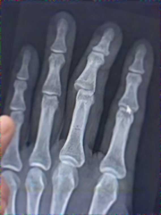 원래 사진은 좀 무서울 수 있어서 X-ray로 대체함 ㅜㅜ....공만보고 뛰던 중 턱을 발견하지 못하고 그대로 넘어졌으며 일어나보니 오른쪽 팔꿈치는 출혈과함께 찢어져 있었고 왼손가락 중지는 형체가 뒤틀려 있었다.
