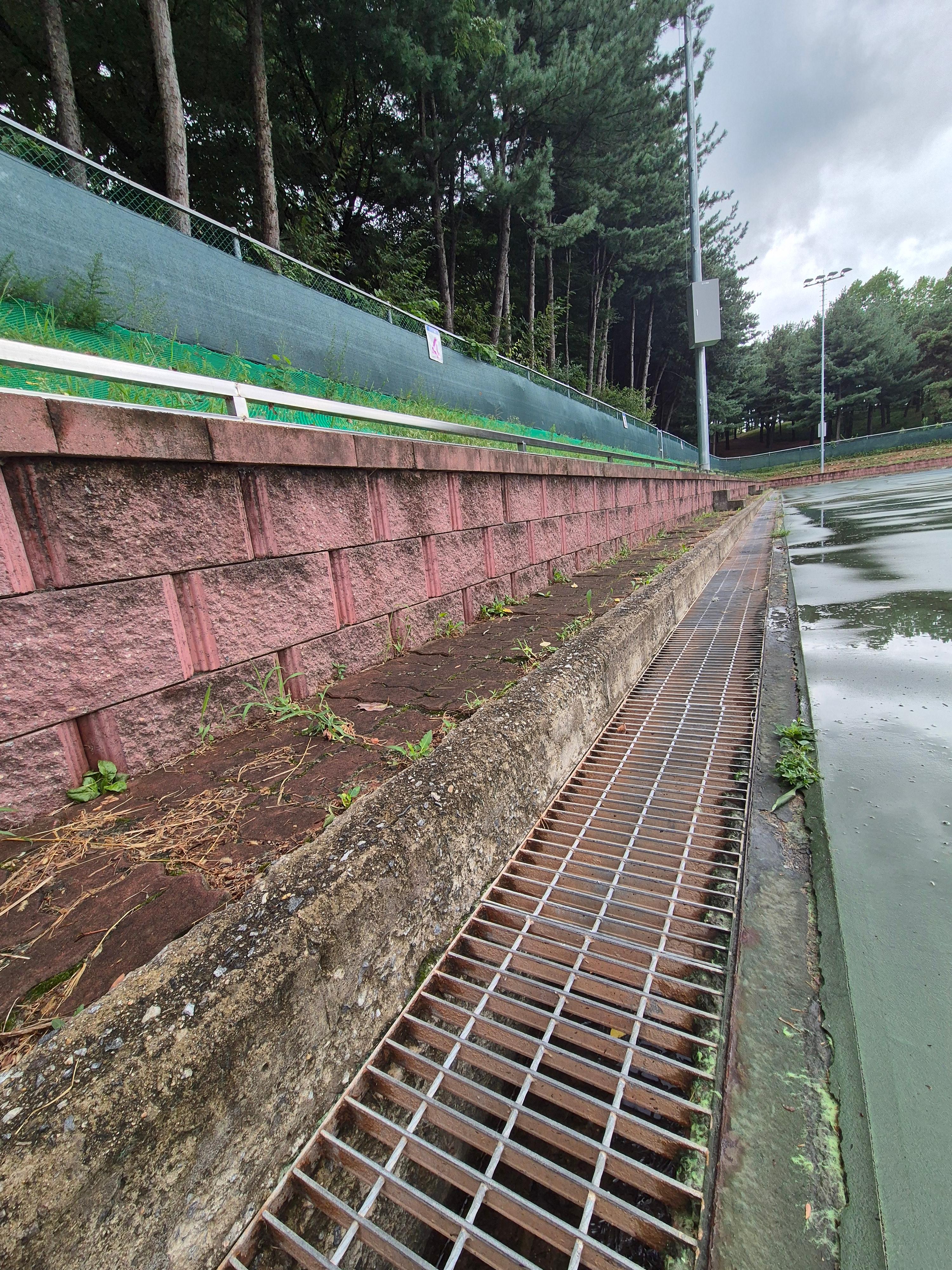 여기에는 배수구 앞에 턱이 있고 어떤 안전 장치가 없다. 그렇게 공을보고 열심히 운동을 하던 중 크게 다치는 사고를 당했다.